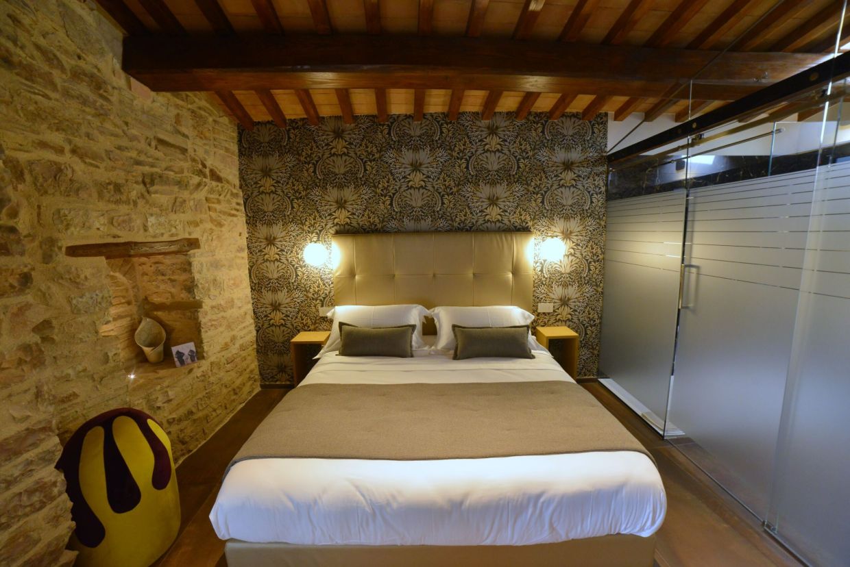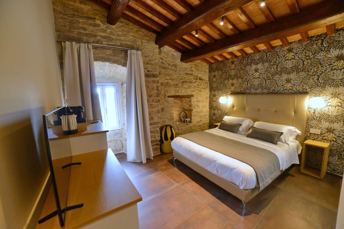 La stanza è completamente indipendente e curata nei minimi dettagli, con arredi di pregio e finiture moderne. Dalla finestra si gode una splendida vista panoramica sulla vallata, perfetta per immergersi nell’atmosfera unica del borgo.
